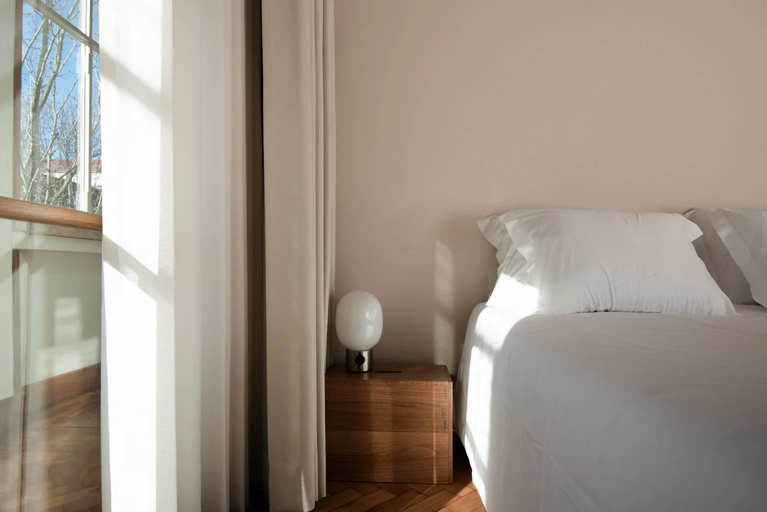 The new layout opens up a second circulation axis adjacent to the main façade, flooding the space with light from both sides. The bedrooms are placed inside an open layout of social spaces as capsules, albeit preserving their privacy through the use of curtains. The spacious living room is located in the elbow of the building, divided in two by a simetry axis perfectly coincident with the angle between the two streets.